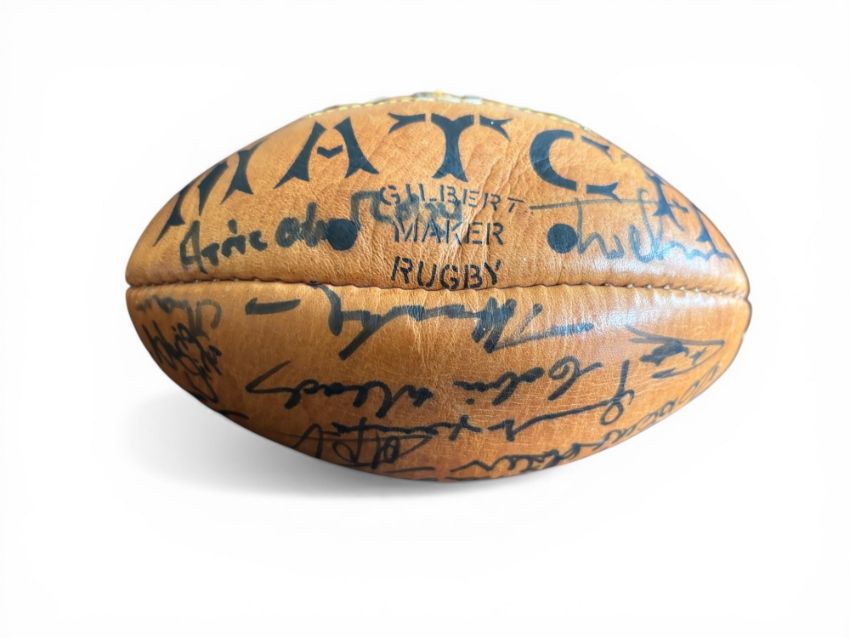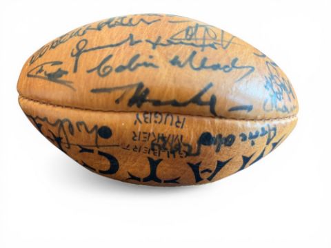RWC Multi-Signed Miniature Gilbert Match Rugby Ball: In lovely condition, tan with lace, clearly signed in black ink by a host of big names, ex-players, managers and administrators at RWC, inc Colin Meads, Clive Rowlands, Bob Norster, John Gainsford, Noel Murphy, Jack Rowell, Leo Williams and Brian Levine etc. Terrific neat, compact memorabilia, perfect for display