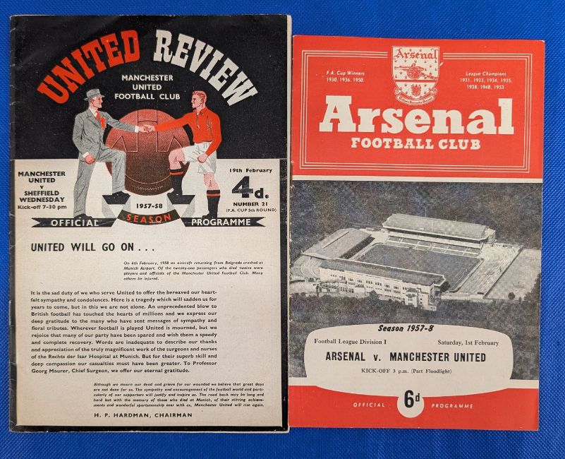 1957/58 Arsenal v Manchester United Division 1 match programme 1st February 1958 (famous 4-5 result match), 1957/58 Manchester United v Sheffield Wednesday FAC programme 19 February 1958 (has token United team written in)