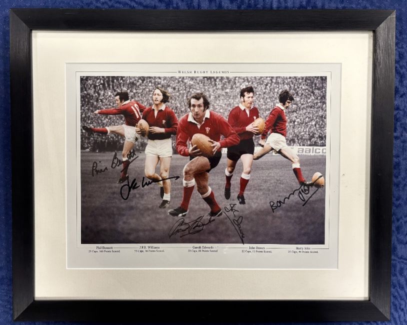 Wales Rugby Legends signed Photograph mf&g: Super collage image of five greats, J P R Williams, Barry John, Gareth Edwards, Phil Bennett and John Dawes, all in colour against a b/w background and hand-signed by each of the ‘Famous Five’. Mounted and framed in black. Lovely desirable lot