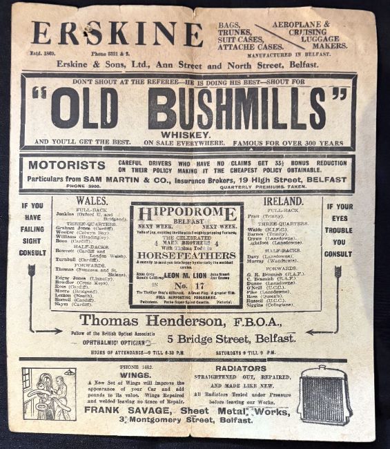 Rare and Interesting 1933 ‘Pirate’ Ireland v Wales Rugby Programme: Folded semi-stiff near A4 card, some wear, with teams (inc Wooller of Colwyn Bay!) for the Belfast clash and a host of adverts, including the printers of this unofficial effort, even harder to obtain than the IRFU’s own! Go for it…