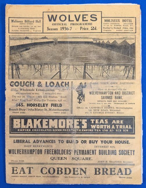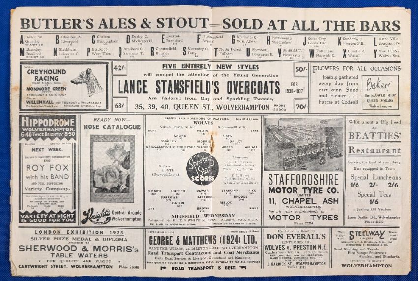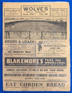 1936 Wolverhampton Wanderers Wolves Home League Football Programme 5th Sep 1936 v Sheffield Wednesday - has an advert cut out from last but one page, with age related wear. F