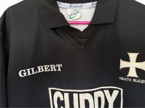 2001 Neath RFC Andy Moore no.9 Match worn Rugby Jersey: Iconic ‘Welsh All Blacks’ issue, Maltese Cross badge, worn by Welsh cap Andy Moore. VG