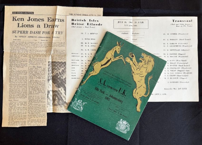 1962 British and I Lions in S Africa 1st Test Rugby Programme: The super double issue for the drawn Jo’burg Test clash and the Transvaal encounter, with the official insert for the latter, too. Splendid, with large press cutting too. VG/Exc