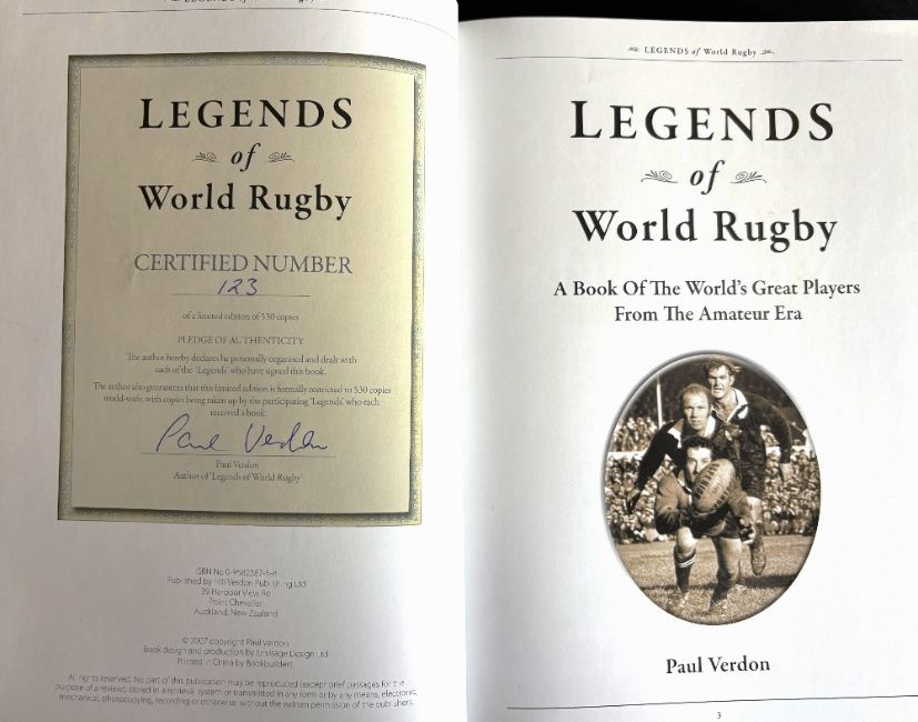 2007 Paul Verdon’s ‘Legends of World Rugby’ Special Limited Ed Book: Cased in attractive box, his labour of love in luxury style, copy no. 125/530, NZ published, the details of 75 worldwide stars, all of whom have neatly signed at the front of the volume. Beautifully illustrated and presented, special item. VG/Exc