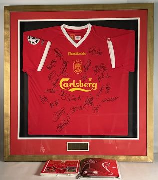 2001-2003 Liverpool Home Shirt multi signed by the first team #20, good signatures to include Danny Murphy, Steven Gerrard, Gregory Vignal, Emile Hesky, Michael Owen and more, well framed under Perspex - comes with a book Liverpool Greatest Players, Istanbul 2005 v Champions League Final programme, and newspaper articles size 88cm x 93cm