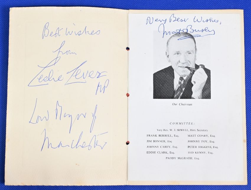 1957 Celebration Dinner Menu and toast list for the honour of Matt Busby at the Midland Hotel, Manchester 17 October 1957 signed by Matt Busby and Leslie Lever (Lord Mayor); good. (1)