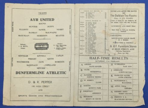 1948 Ayr United v Dunfermline Athletic Postponed League B Football Programme 21st Feb 1948, 4 page programme