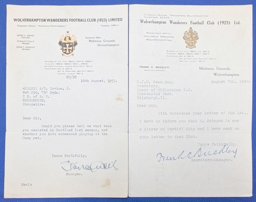 1940 and 1953 Wolverhampton Wanderers Wolves Football Correspondence Letterheads: a letter from Stan Culis 10th Aug 1953 with a good signature to J Irvine and a 1940 Frank Buckley letter with auto pen signature to Heart of Midlothian FC - regarding a Cardiff player W Cringan