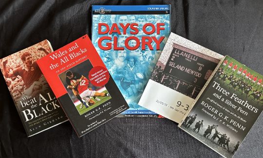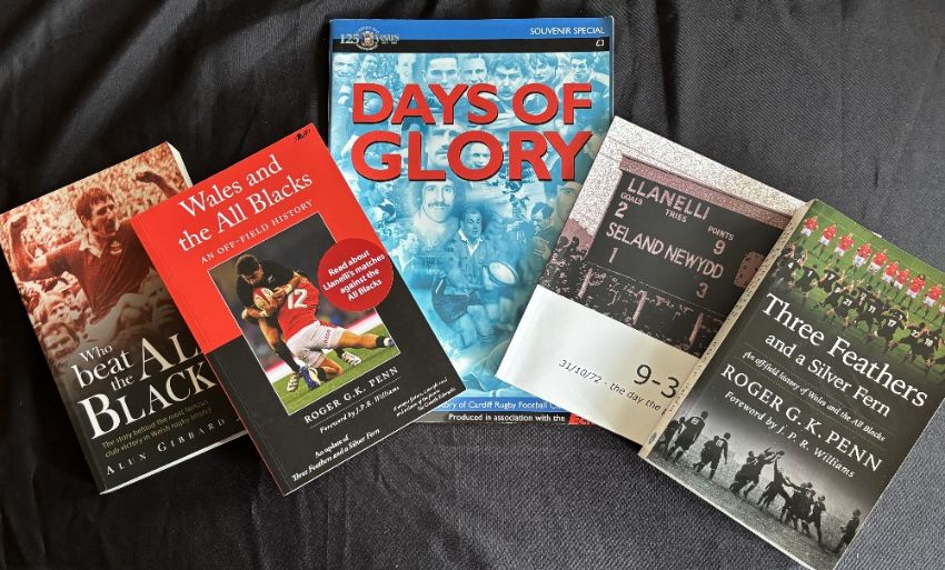 Welsh and New Zealand Interest Rugby Literature (5): R Penn, ‘Three Feathers anda Silver Fern’, 2013, and its update, ‘Wales and the All Blacks’, 2022, signed by author; ‘Who Beat The All Blacks?’, A Gibbard 2012; ‘9-3’, photos from the day, AT Richards; and SW Echo s/back, Cardiff RFC 125th, ‘Days of Glory’, 2001-2. VG
