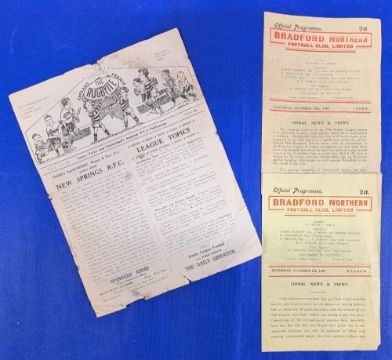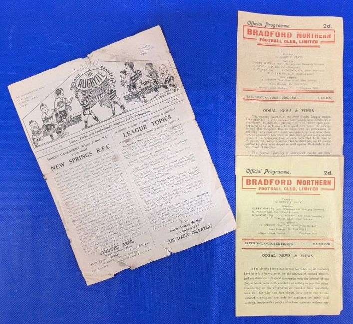 1946 Rugby League Programmes Bradford Northern Oct 5th, 1946, v Barrow, Sat Oct 19th. 1946 v Leeds and Rugbyite publication Vol 2 No.10 Oct 1948