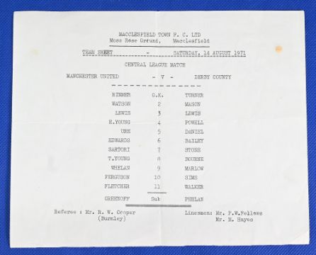 Very Scarce Manchester United 1971/72 home reserve single sheet programme Manchester United v Derby County played at Macclesfield Town FC 14 August 1971 (Old Trafford not available); slight crease, o/wise good. (1)