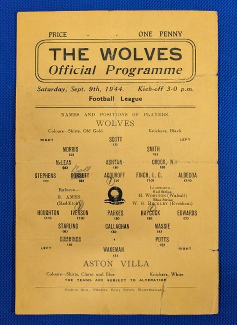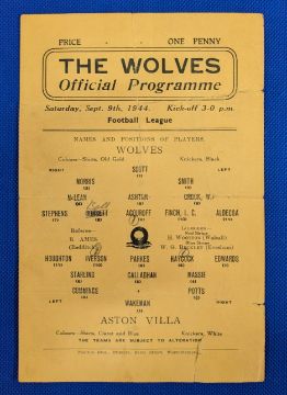 1944 Wolverhampton Wanderers Wolves Single Sheet Football War League v Aston Villa match played 9th Sept 1944 folded fair