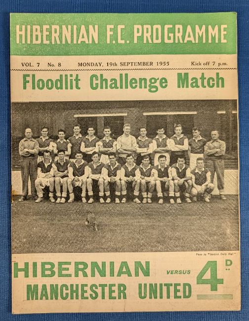 1955/56 Hibernian v Manchester United floodlit challenge match programme 19 September 1955 at Easter Road; fair/good. (1)