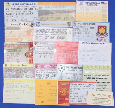 TICKETS: 1999/2000 Manchester United away Premier League match tickets v Leeds United, Arsenal, Everton, Coventry City, Wimbledon, WHU, Sunderland, Watford, Middlesbrough, Sheffield Wednesday, Spurs; Worthington Cup away v Aston Villa; Champions League v Sturm Graz (Austria); friendlies away v Wigan Athletic (stadium opening), Oxford united (Ford testimonial), Selby Town (friendly), Worksop Town (friendly); plus at Old Trafford – Sir Alex Ferguson testimonial – Manchester United v Rest of the World; fair/good. (18)