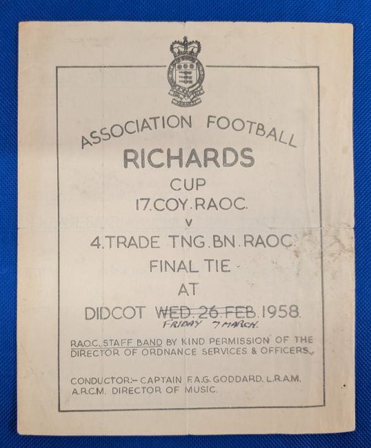 1958 Army football the Richards Cup Final; 17 COY RAOC (including Bobby Charlton) v 4 TRADE BN RAOC at Didcot dated 26 February 1958 (cancelled); revised to 7 March 1958, 4 page match programme, team changes, small tear. (1) NB: Bobby was in recovery following the disaster, hence the match was cancelled and played on the revised date