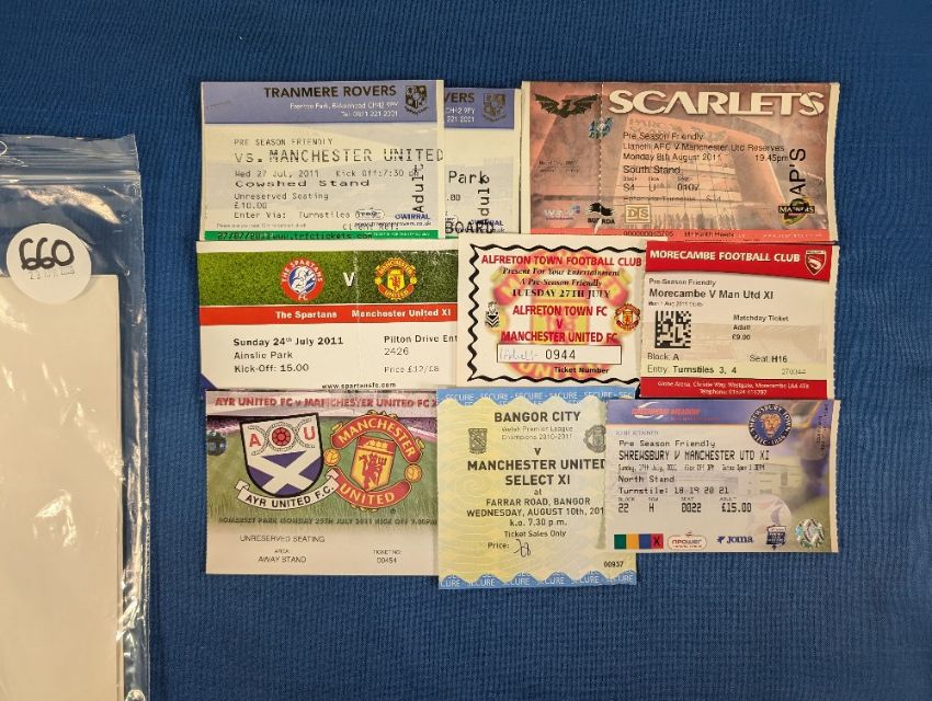 TICKETS: 2011/12 Manchester United away friendly match tickets v Tranmere Rovers + car park, Llanelli, The Spartans, Morecambe, Shrewsbury Town, Bangor City, Ayr United, Alfreton Town (undated); good. (8)