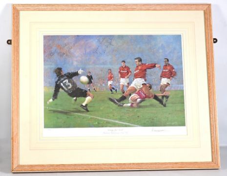 Manchester United v Aston Villa ‘Going for Goal’ Craig Campbell signed Football Print, with eclectic signatures of Nobby Stiles, Ian St John and artist Craig Campbell, limited edition No.130/500 framed under glass 61cm x 74cm