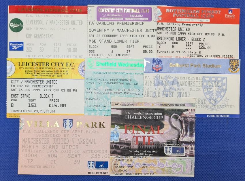 TICKETS: 1998/99 Manchester United Treble Season away match tickets v Liverpool, Coventry City, Nottingham Forest, Leicester City, Sheffield Wednesday, Wimbledon, Arsenal (FAC s/f at Villa Park), Newcastle United (FAC final at Wembley); fair/good. (8)