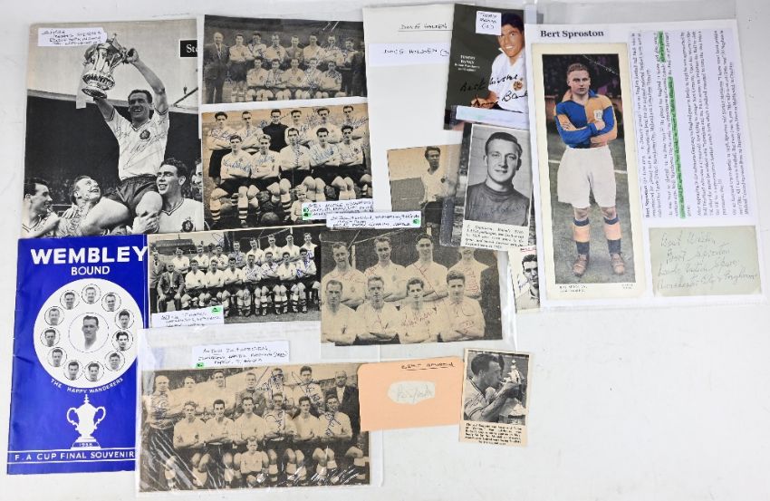 Bolton Wanderers FC 1958 Wembley Bound FAC Final Souvenir 40 pages handbook: plus a collection of player pictures each with signatures Higgins, Hopkinson, Barrass, Tommy Banks x2, Doug Holden x3, Nat Lofthouse plus others (3). Also has Bolton team pictures listed A – E with multiple signatures (39 counted, some duplication). Total 50+ autographs in one wallet) NB: Full list included