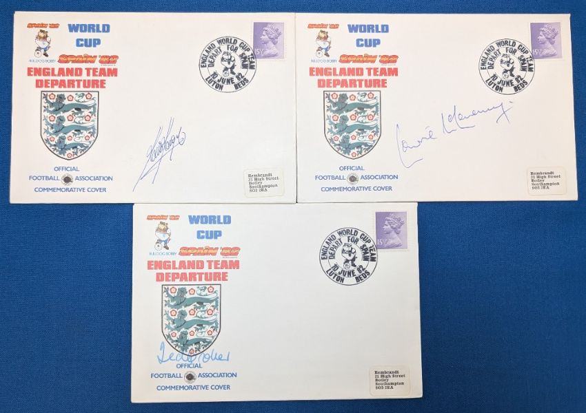 3x 1982 World Cup England Team signed Football FDC covers: Kevin Keegan, Laurie McMenemy, Ted Croker (3 FA)