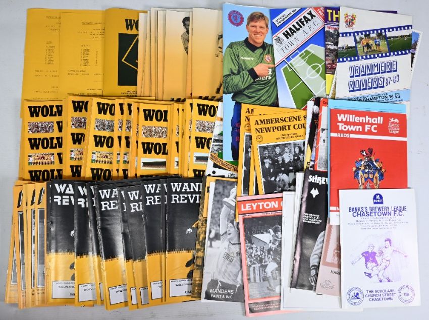 1985- 90 Wolves Wolverhampton Wanderers Home & Away Football Programmes: League, Cups, Friendly, Testimonials - noted 85-86 home x27 John Richards benefit, Neville Hamilton charity match, aways x26 to include Freight Rover Trophy, 86-87 home x27 v Southampton friendly Shrewsbury friendly both single sheets, aways x29, 87-88 home x31 plus former players dinner card, aways x35 Nigel Spink testimonial, Birmingham Senior Cup Alistar Robertson testimonial Bilston friendly, 88-89 home x31, home x34 with friendlies v Bilston, Halesowen Town, Chasetown FC, Aberystwyth, 89-90 homes x30 with QPR friendly, 100 years v Moscow Dynamo, Ted Falmer Testimonial, homes x36, with v Milford Hall, Hednesford Town, Derby Chasetown, Tividale, Burton centenary final, Scunthorpe, Barum Archie Richards benefit, Aston Villa Birmingham County Senior Challenge Cup 2nd round