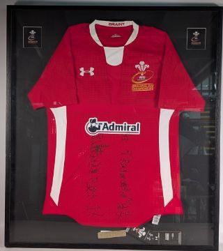 2012 Wales Grand Slam Squad-Signed framed Rugby Jersey: mf&g, WRU merchandise, ltd ed 13/100, player-standard scarlet fully-logoed jersey, signed to the front in black marker by the successful squad. Fine display item, VG