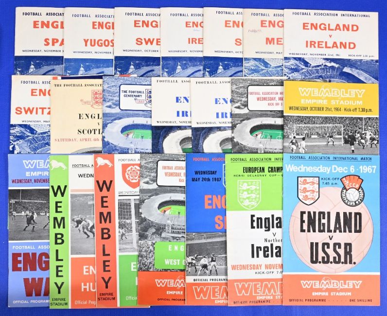 Selection of England international home programmes and match tickets (tickets have score and usually pinned in,) 1967 Scotland, 1978 Hungary, 1978 Czechoslovakia, 1979 N. Ireland, 1979 Denmark, 1980 Republic of Ireland, 1979 Bulgaria, 1980 Argentina, 1980 Norway, 1980 Switzerland, 1981 Spain, 1981 Romania,1981 Brazil, 1981 Scotland, 1982 N. Ireland; England homes programmes (only) from 1955 Spain, 1956 Yugoslavia, 1959 Sweden, 1959 Ireland, 1960 Spain, 1961 Mexico, 1961 Ireland onwards covers years up to 1999 (78) plus 1970 England to Mexico (1970 World Cup) Jimmy Hill’s publication); Wales international home programmes v 1951 Switzerland (Festival of Britain), 1954 Ireland (Harry Gregg + Peter McParland + Billy McAdams all making debuts), 1955 England, 1955 Austria, 1956 Scotland, 1960 Scotland, 1961 Spain, 1967 England, 1969 German Democratic Republic, 1970 N. Ireland, 1972 England, 1973 Scotland, 1975 Scotland, 1976 England, 1976 Yugoslavia, 1977 Czechoslovakia, 1977 Scotland, 1979 West Germany, 1980 England, 1987 Finland, 1987 Denmark, 1988 Yugoslavia; varied condition. (1 box of quantity)
