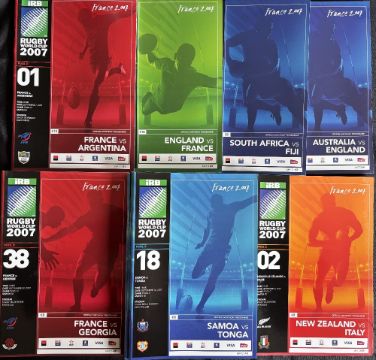2007 RWC in France Semi, two Quarters and 15 Pool Rugby Programmes (18): E v F semi, E v Aus and SA v Fiji, quarters, and Fr v Georgia, Arg and Ireland; Tonga v USA, Samoa and Eng; Romania, NZ and Portugal v Italy; SA v Samoa and Eng(2); Samoa v Eng; and Namibia and Ireland v Arg. VG, fine selection
