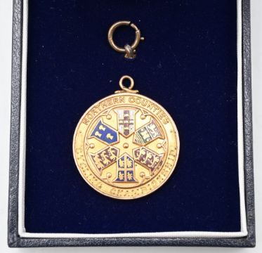 1897 Northern Counties Cycling Championship Gold Medal – engraved to the reverse ‘10 Mile Won by W H Burrows 1897’, obverse with enamelled emblem, measures 27mm approx. dia, 9g
