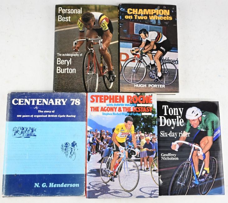 Bicycle and Cycling Books (5) incl Centenary 78 the Story of 100 years of organised British cycle Racing, Tony Doyle Six-Day rider, Personal Best Autobiography of Beryl Burton, Champion on Two Wheels Hugh Porter (Signed), The Agony & The Ecstasy Stephen Roche’s World of Cycling – condition mixed A/G overall
