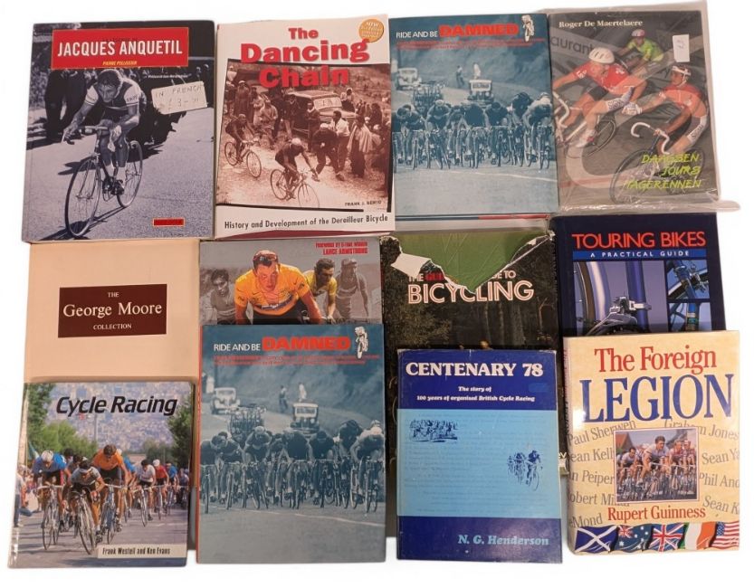 Cycling and Road Racing Hardback Books, large format books: to include Ride and Be Dammed Chas Messenger x2 Centaury 78 H G Henderson, The George Moore Collection, Guiness Guide to Bicycling, plus paperback 22003 Tour de France Guide, Roger D E Maertelaere Daagsen Tours, The Dancing Chain Frank J Berto, The Foreign Legion Rupert Guiness, Touring Bikes Tony Oliver, Jaques Anquetil - French published, cycle racing Frank Westell