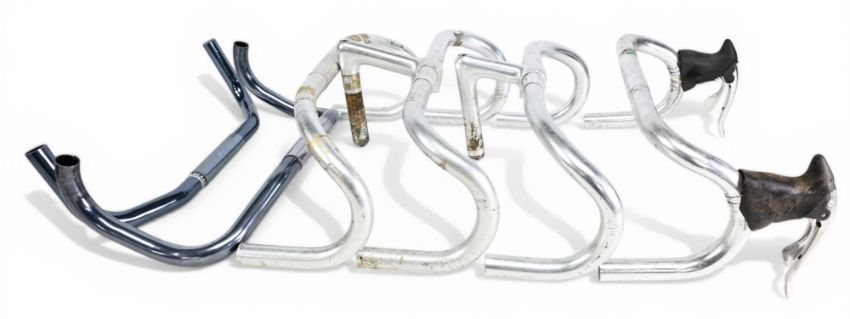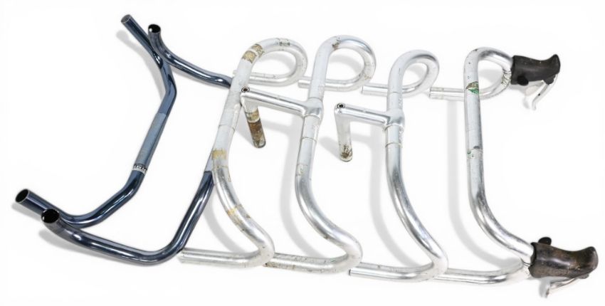 Cycling Accessories – 6x various Handlebars – details such as 3ttt with Campagnolo brake levers, Cinelli Campione Del Mondo and Cinelli stem, Cinelli marked handlebars and stem, Cinelli Criterium 65-40, 2x Cinelli Tempo marked bars one appears cut – measuring 40cm approx. – mixed condition