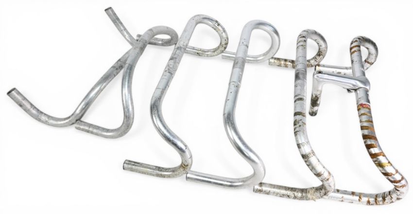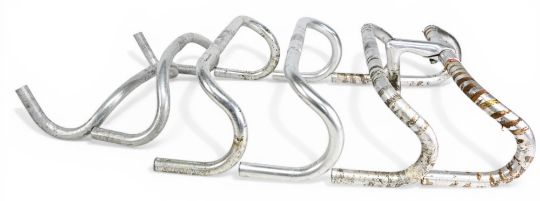 Cycling Accessories – 6x various Handlebars – details such as Cinelli 64-40 GIRO with Cinelli stem, Cinelli 66-42 Campione Del Mondo, Cinelli 64-42 GIRO, plus GB and 2x unmarked example – measuring 37-42cm width approx.– mixed condition
