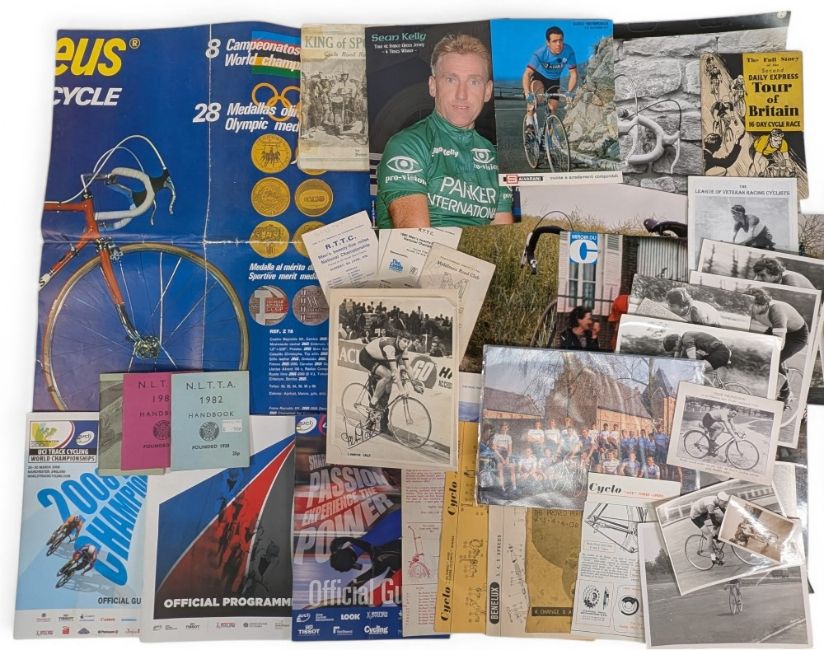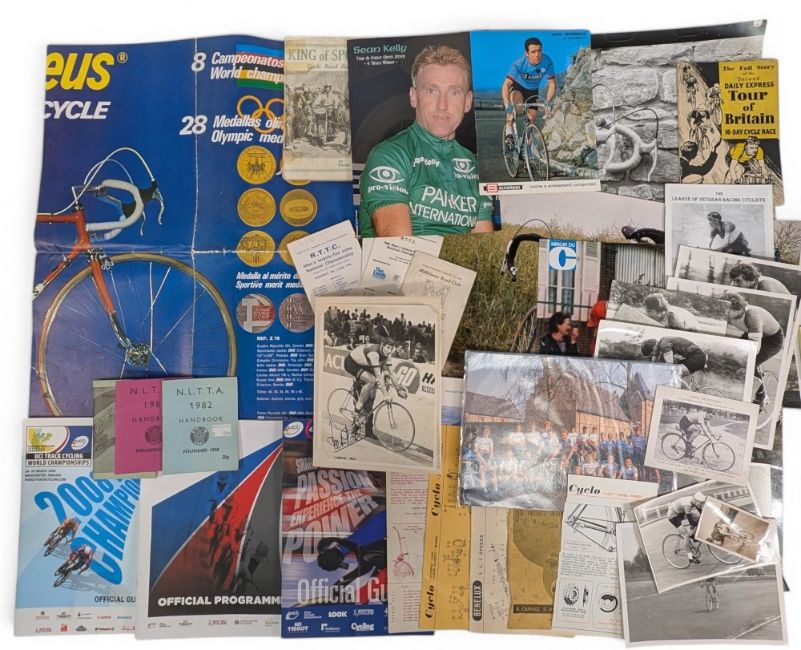Period Cycling Racing Programmes, Photographs, Posters, and Magazines: signed photograph of Sean Kelly, Kevin Poole, 1975 Zeus World Championship Poster, Cyclo and Beneluz Instructions, Kings of Sports Cycle Road Racing Booklet, Cyclist Touring Club Annual 1962, NLTA 1980, 1982 Handbook, Period Photographs, Race Cards, Programmes Tour of Britain 1952 from The Daily Express, National Hill Climb 1989, 2008 World Championships, UCI World Cup Manchester and Official Guide