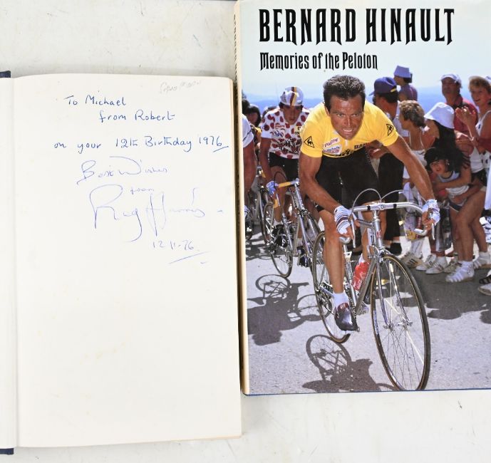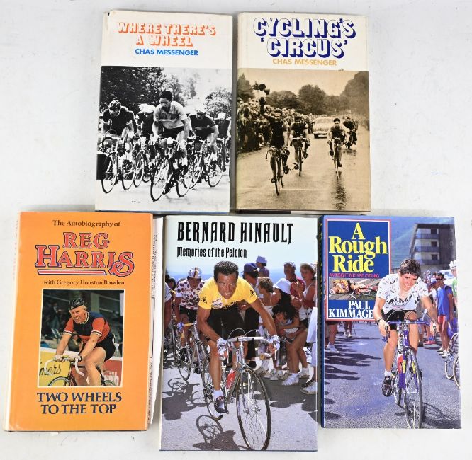 Bicycle and Cycling Books (5) incl Reg Harris (Signed) Two Wheels To The top, Bernard Hinault Memories of the Peloton, A Rough Ride Paul Kimmage, Where There’s A Wheel, Cycling’s Circus both by Chas Messenger – mixed condition A/G overall