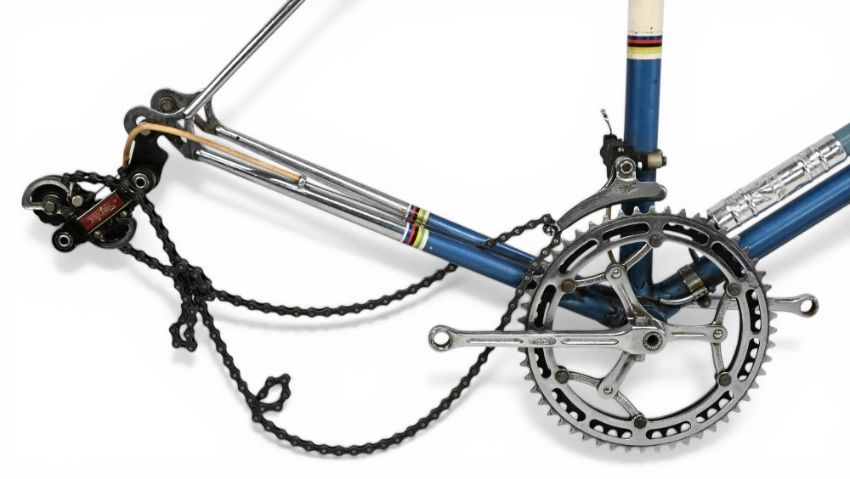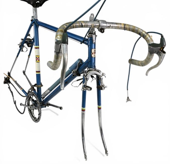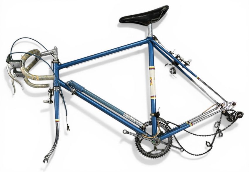 Vintage ‘Automoto’ stamped Bicycle Frame – 22” with ‘Automoto’ metal head badge, no apparent frame markings, with Cinelli Unicanitor leather saddle, integrated pump pegs with pump, Mafac brake callipers, Simplex derailleurs