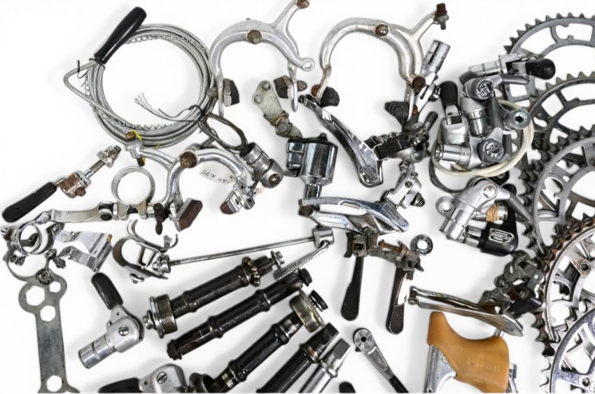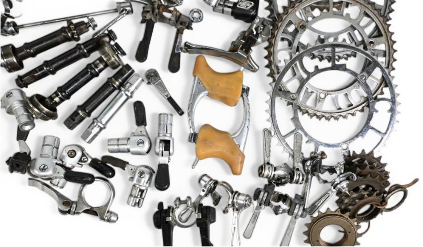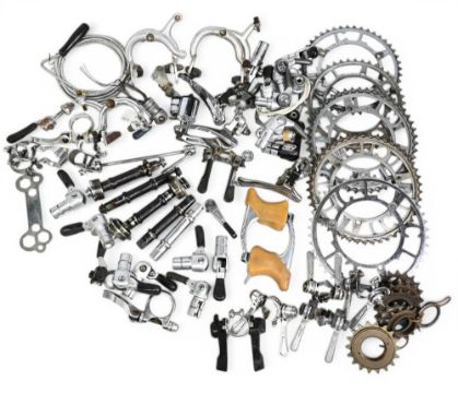 Cycling Parts/Accessories – Box of various components – Campagnolo gear levers, levers, axel/spindles, front gear sprocket, sprockets etc mixed condition – small box