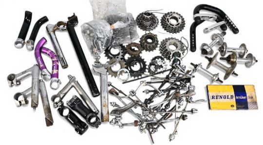 Cycling Parts/Accessories – Box of various components – Campagnolo quick release skewers, wheel hubs, gear cassettes, sprockets, seat posts, handles etc – mixed condition – small box