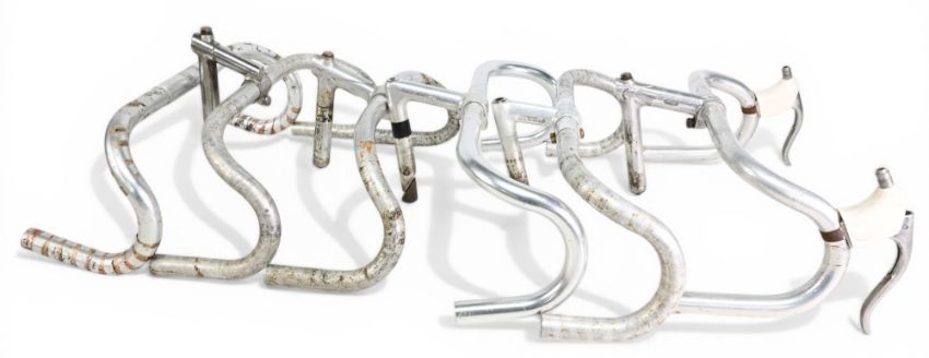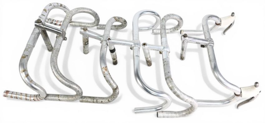 Cycling Accessories – 6x various Handlebars – details such as SR Road Champion Sakae custom with Ambrosio Evian stem, unnamed handlebars with brake levers and Pivo stem, Cinelli 63-40, Belleri handlebars with SR Japan stem, Concorde Trade mark handlebars with AVA stem, unnamed handlebars with Van Hauwert stem– measuring 37-42cm approx. – mixed condition
