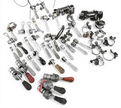 Cycling Accessories – Mixed selection – features Campagnolo gear levers and brackets, levers, varied quick release skewers some Campagnolo etc, Campagnolo box (empty) – mixed condition – small box