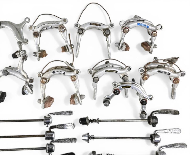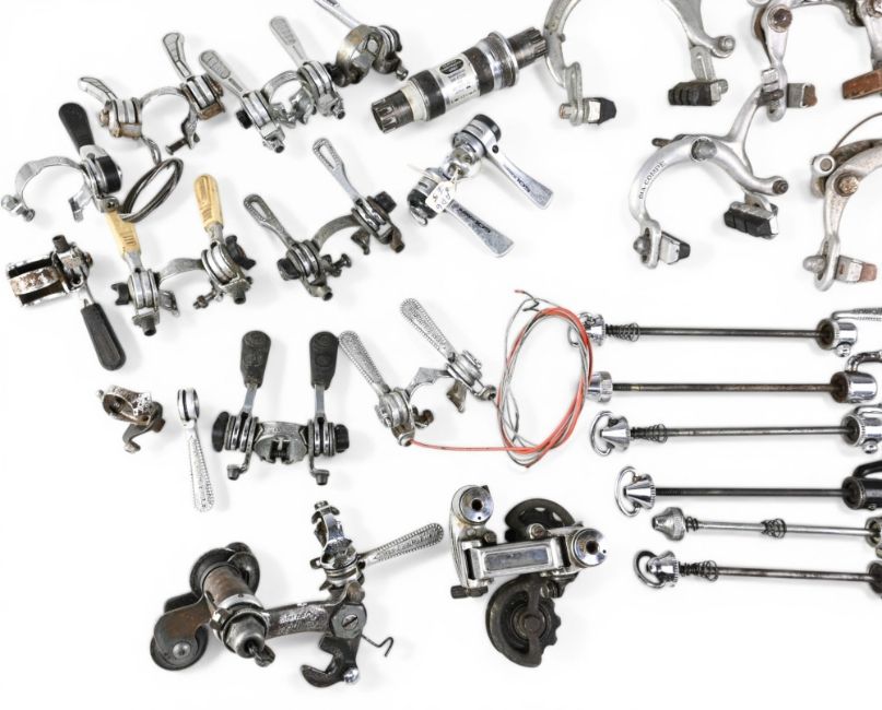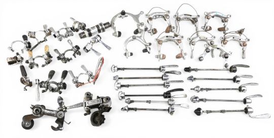 Assorted Bicycle accessories/parts – brake callipers, quick release skewers, gear selectors/shifters, rear derailleurs – Campagnolo, Huret, Shimano – condition mixed