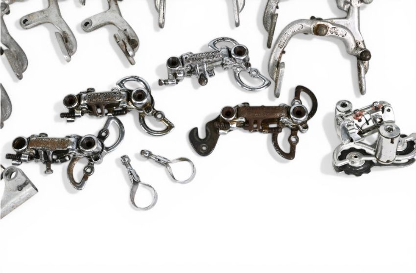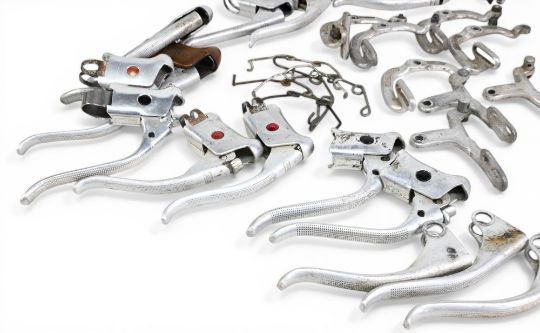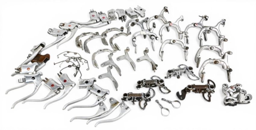 Cycling Parts/Accessories – features brake callipers and levers – marked Coureur, Hiduminium, Weinmann brake levers, Campagnolo derailleurs – etc mixed condition – small box