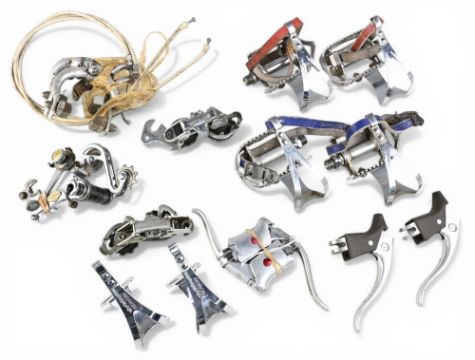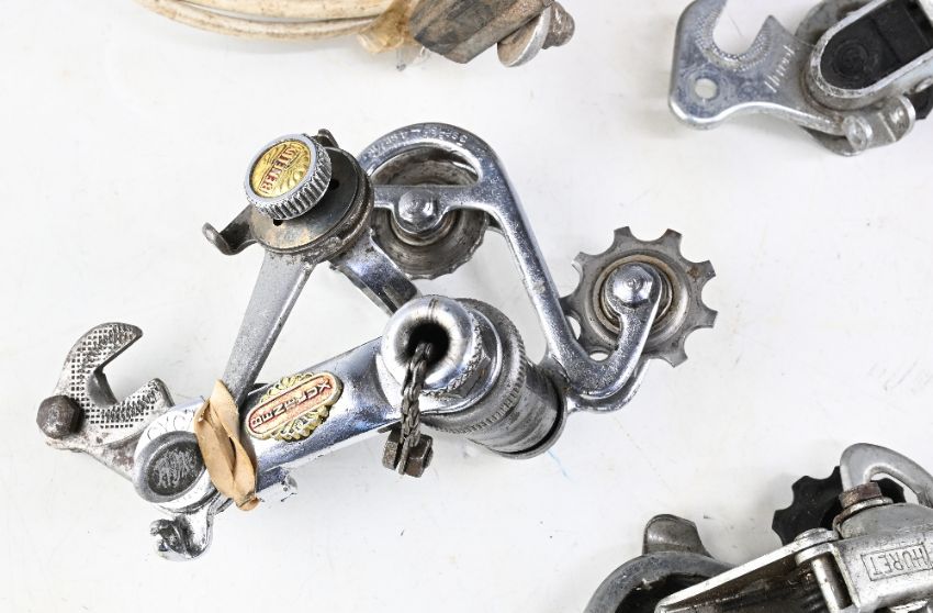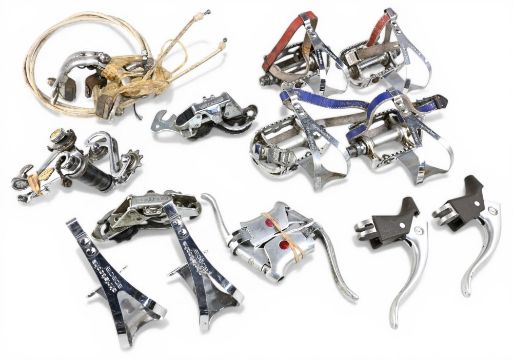 Cycling Accessories – Lyotard vintage Pedals with toe clips, unnamed pedals (broken at end) with toe clips, Shimano Tourney brake callipers, Cyclo Benelux rear derailleur, Sachs Huret derailleur x2, Gipiemme brake levers, Weinmann brake levers etc – mixed condition