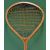 Interesting "Jefferies" wooden tennis racket - small concave wedge - original sheepskin grip and decorative blue collar. Original stringing with five rows of trebling near the wedge and six rows to the top of the racket - no breaks. Measures 56cm^ remnants of leather band around the top. Two small cracks towards the top of the frame and a small one to the wedge. Small degree of warping to the head - Jefferies were very early tennis rackets