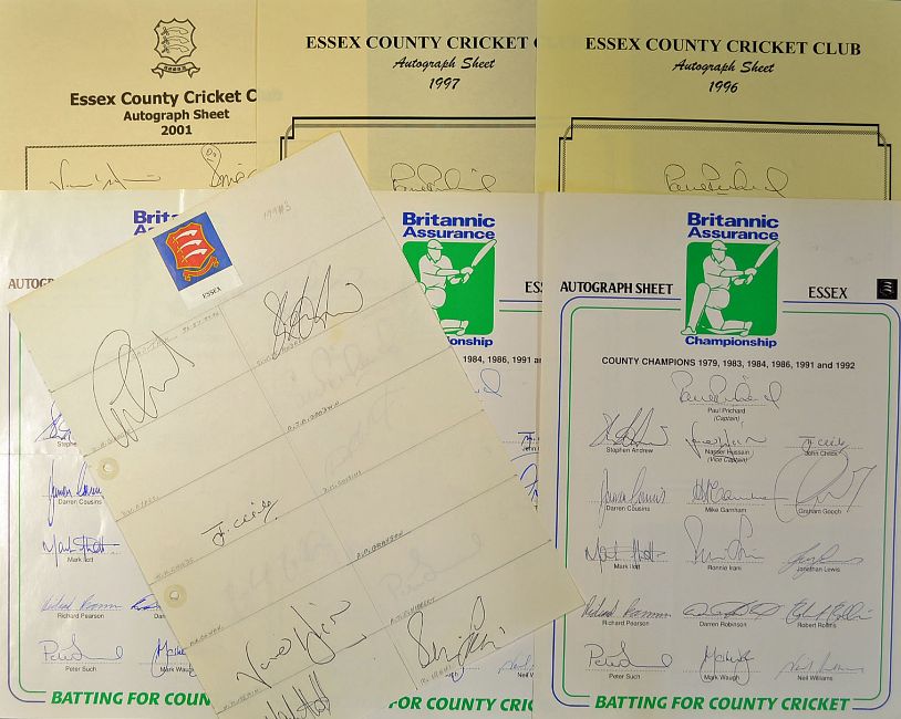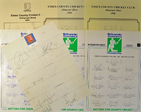 Collection of 1993 onwards Essex CCC signed team sheets including players such as Gooch^ Hussain^ Such^ M Waugh^ Pritchard^ Irani and many more^ with #95 (8)