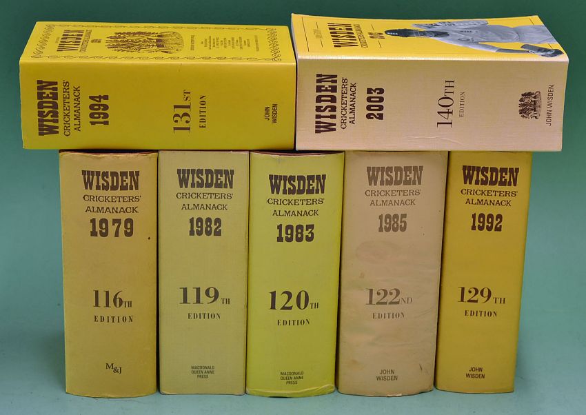 Wisden Cricketers' Almanacks 1979^ 82^ 83^ 85^ 92^ 94 and 2003 in original hardbacks with DJs except 82 and 2003 softbacks^ all in generally G condition with minor wear (7)