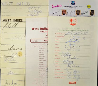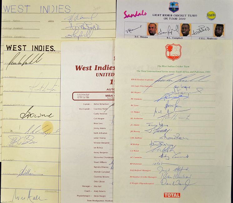 Selection of 1993-2000 West Indies signed cricket team sheets winning the 1993 test series and featuring players such as Lara^ Logie^ Simmons^ Ambrose and more 1x 2000 facsimile^ 65+ autographs (5)