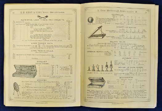 Rare 1883 G B Kent & Sons'Catalogue of Brushes' featuring sports equipment at the end of the catalogue^ sports include Lawn Tennis^ Badminton^ Racquets^ Cricket^ Bagatelle Boards^ Billiard^ Board games and more^ majority of items are of hair brushes^ a unique index of various items and prices within that era^ a softback