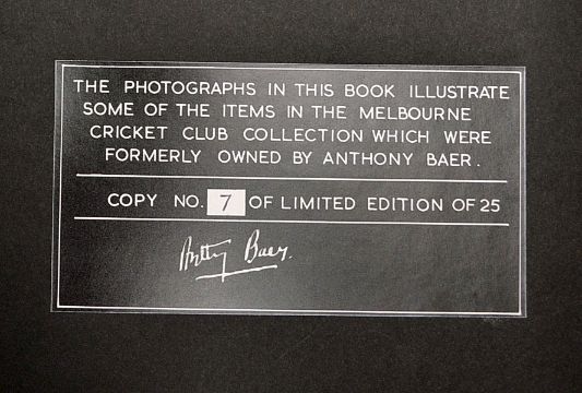 Interesting Cricket photo album of the'Anthony Baer' cricket collection situated in the Melbourne Cricket Club limited edition number 7/25^ to include 65+ photographs of various items of the collection^ all mounted and bound in a padded blue leather album with Chris Pilkington impressed to the front^ in a red velvet covered box