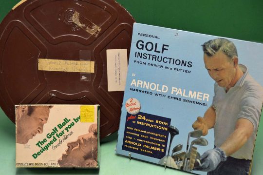 Arnold Palmer golf collection to include Double Album Vinyl titled "Personal Golf Instructions from Driver through Putter" in the original double album sleeve together with "Step by Step" booklet being a full guide to the instructions spoken on the 2 LPs^ 12x Arnold Palmer Golf Balls in the original box and large 16mm film reel titled "Arnold Palmer Golf" divided into 14 sections and lasting for 43 minutes c/w canister (3)
